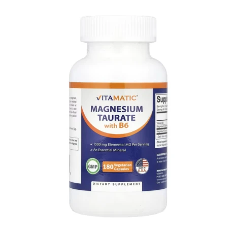 Vitamatic Magnesium Taurate with B6 combines two essential nutrients in 180 vegetarian capsules for comprehensive cardiovascular and metabolic support. This synergistic formula enhances magnesium absorption and utilization for optimal heart health and energy production. Features: - Magnesium taurate for cardiovascular wellness - Vitamin B6 for enhanced magnesium absorption - 180-capsule supply for consistent daily use - Supports healthy heart function and rhythm - Promotes energy metabolism and nervous system health - Vegetarian capsule format - No artificial additives or fillers Magnesium taurate is specifically formulated to support heart health and maintain healthy blood pressure, while vitamin B6 works synergistically to maximize nutrient absorption and utilization. This combination is ideal for those seeking to support cardiovascular wellness, maintain healthy energy levels, and promote overall metabolic function naturally.