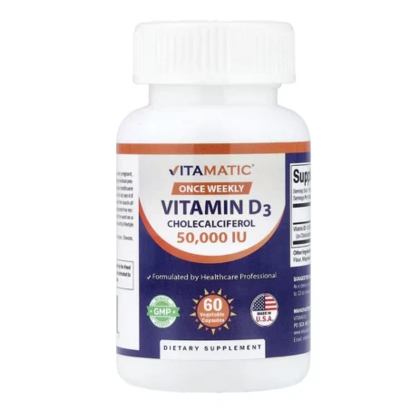 Vitamatic Vitamin D3 is a high-potency supplement delivering 1,250 mcg (50,000 IU) per capsule to support bone health, immune function, and calcium absorption. Each bottle contains 60 vegetarian capsules for convenient weekly dosing. Features: - High-potency 50,000 IU Vitamin D3 per capsule - Vegetarian capsules suitable for all dietary preferences - Supports bone strength and immune system health - Aids calcium absorption for skeletal wellness - Easy-to-swallow capsule format - 60-capsule supply for extended use Vitamin D3 is essential for maintaining healthy bones and teeth, especially in regions with limited sunlight exposure. This supplement is ideal for those seeking to maintain optimal vitamin D levels year-round.